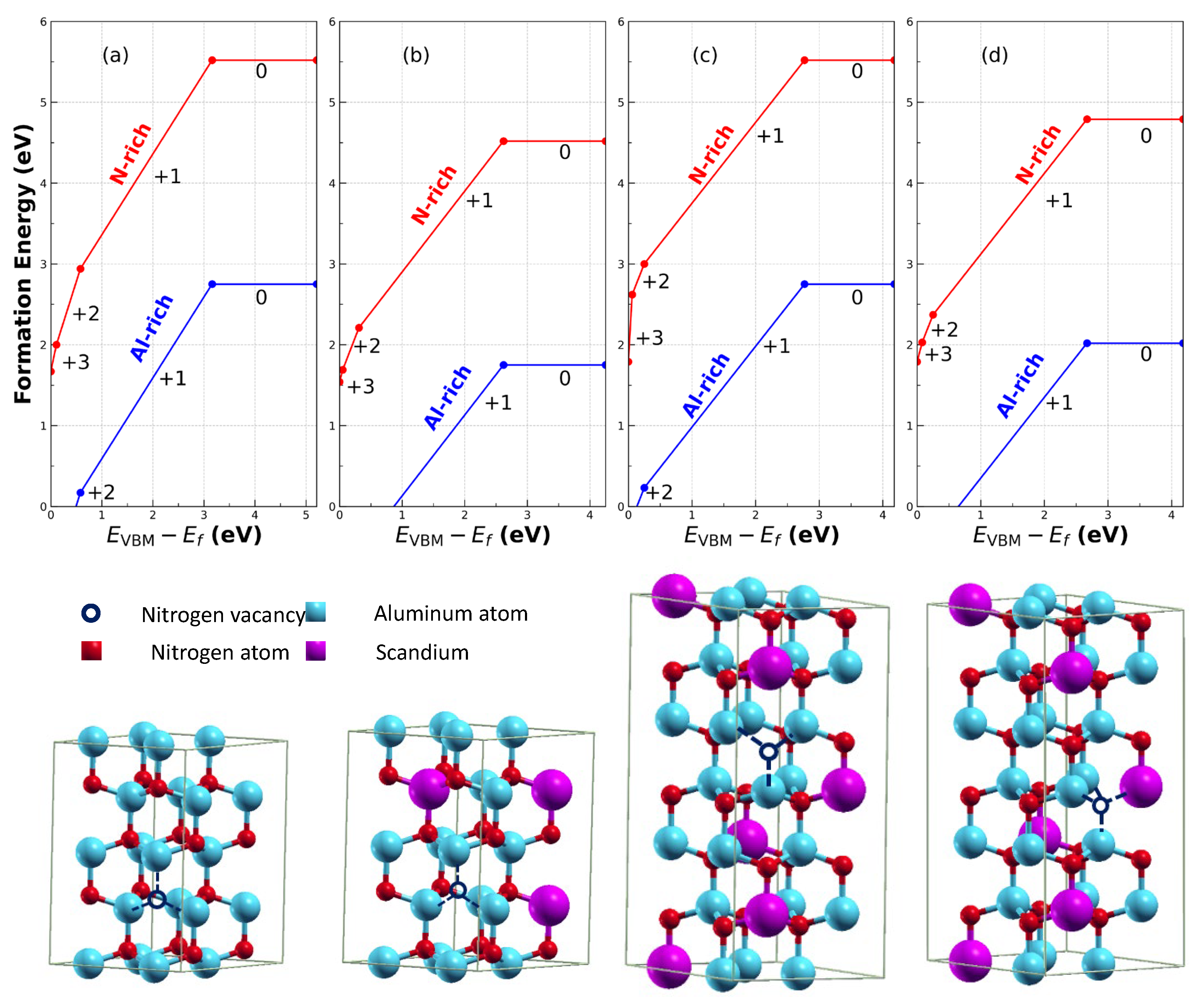 46]. These findings suggest that the formation energy of a N-vacancy in Sc-alloyed AlN is less than in pristine AlN for all charge states, irrespective of whether the system is under N- or Al-rich conditions. Thus, the formation of N vacancies in Al