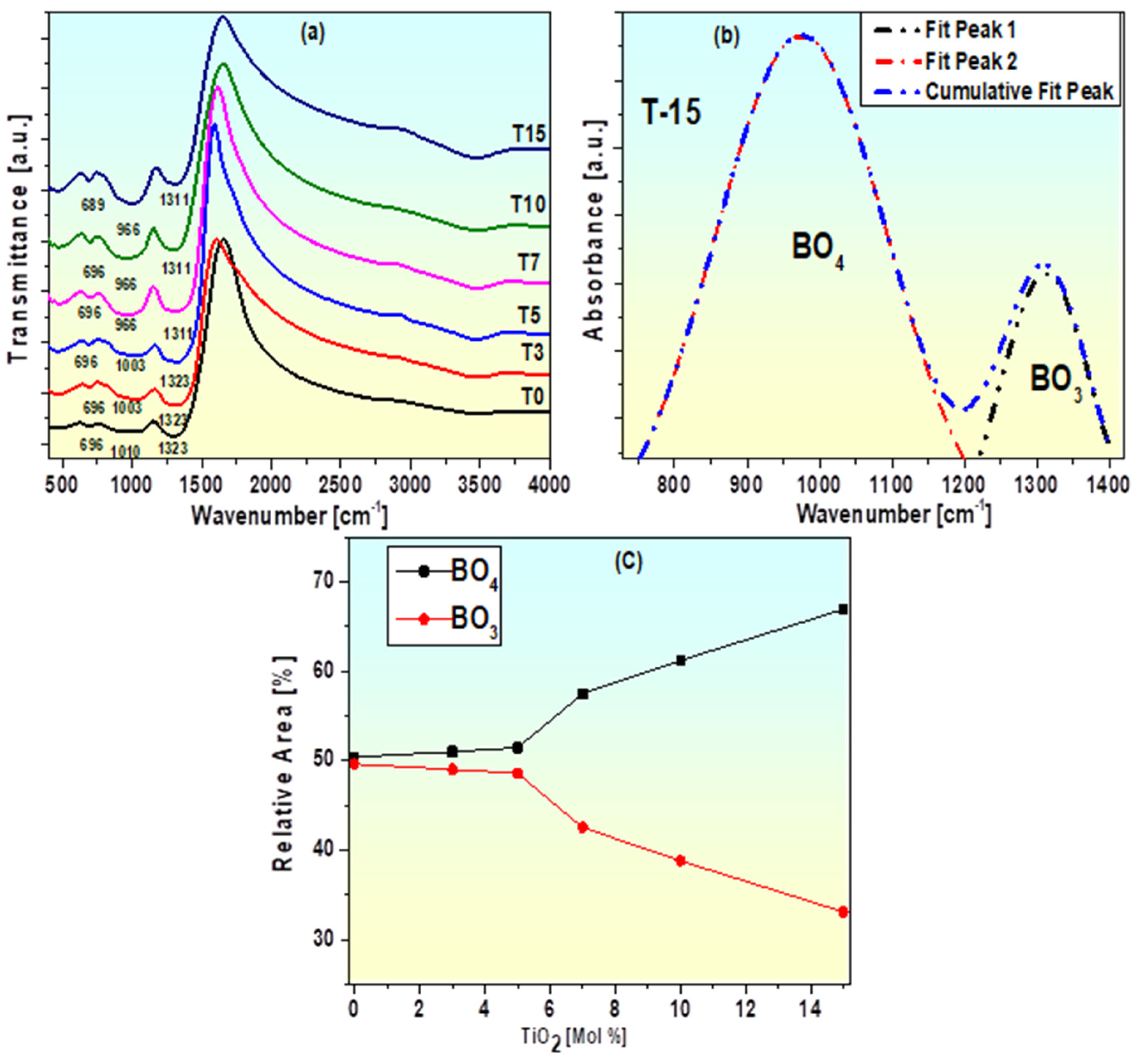 - Ezzeldien, M.; Sadeq, M.S.; Al-Boajan, A.M.; Al Souwaileh, A.M.; Alrowaili, Z.A.; Almasoudi, A.; Amin, H.Y. Impact of TiO2/B2O3 ratio on the structure and optical properties of Na2O–CoCl2–TiO2–B2O3 glass. Ceram. Int. 2024, 50, 12678–12689. [Google Scholar] [CrossRef]