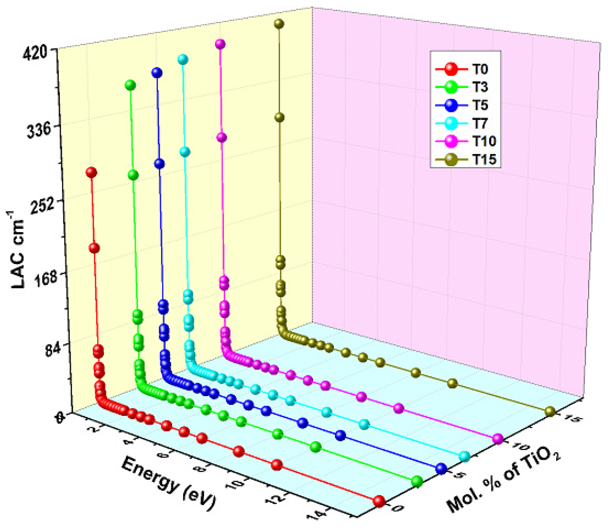 - Al-Ghamdi, H.; Alfryyan, N.; Alsaif, N.A.M.; Abdelghany, A.M.; Higazy, K.S.; Abouhaswa, A.S.; Rammah, Y.S.; Kaky, K.M.; Kadhim, A.J.; El-Agawany, F.I. Impact of TiO2-Doped Bismuth-Boro-Tellurite Glasses: Fabrication, Physical and Optical Properties, and γ-Ray Protection Competence for Optical and Radiation Shielding Applications. J. Electron. Mater. 2025, 54, 1432–1443. [Google Scholar] [CrossRef]