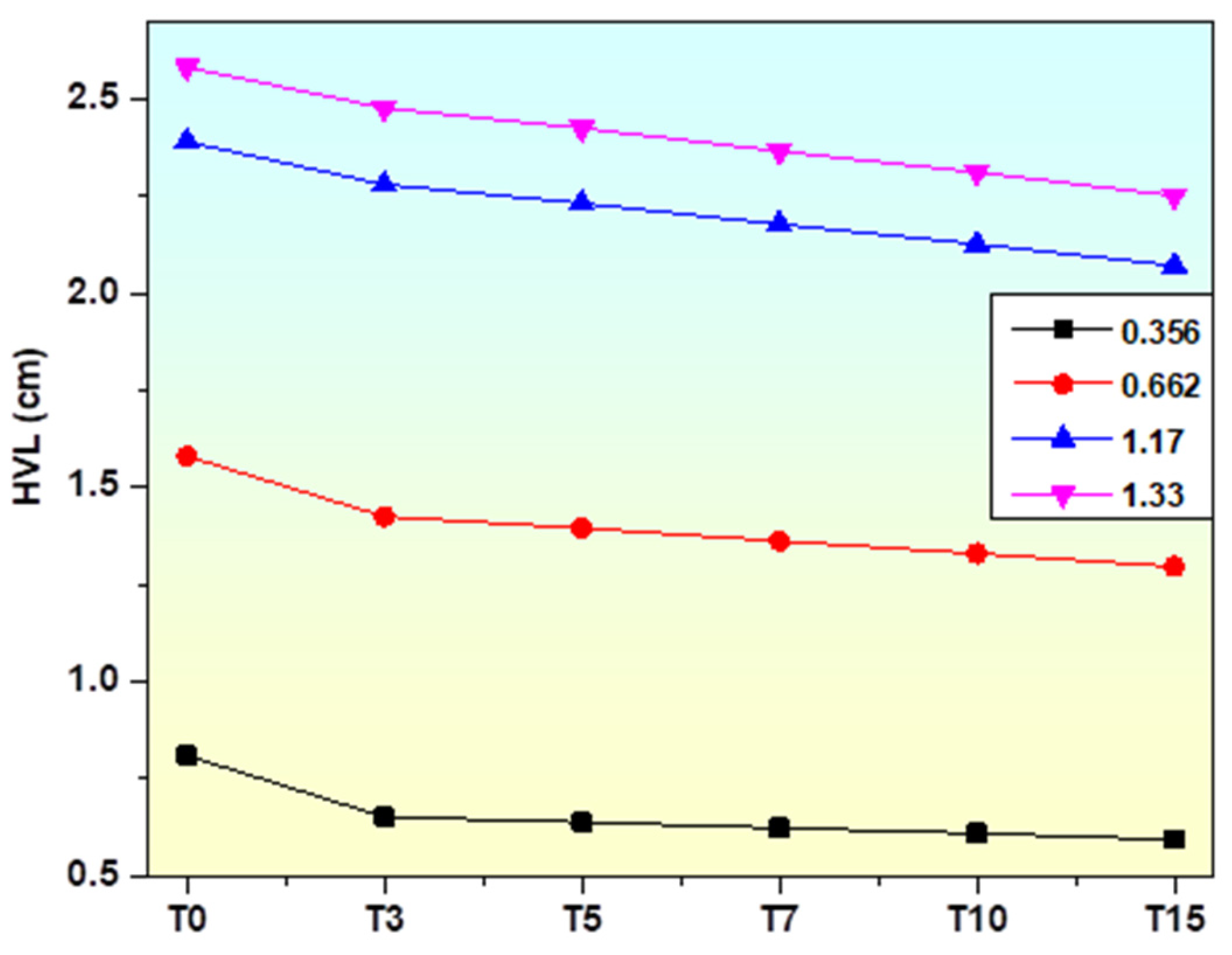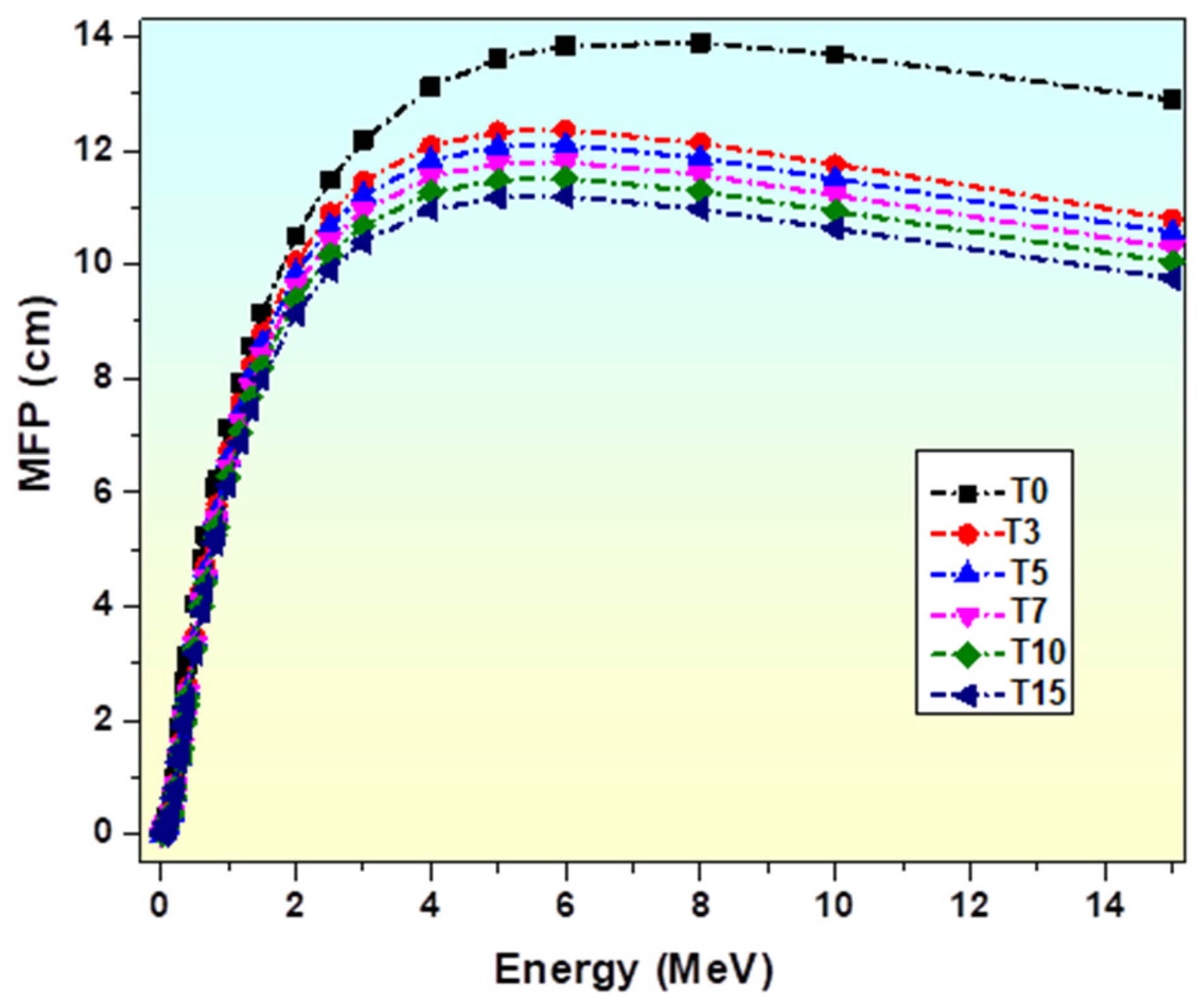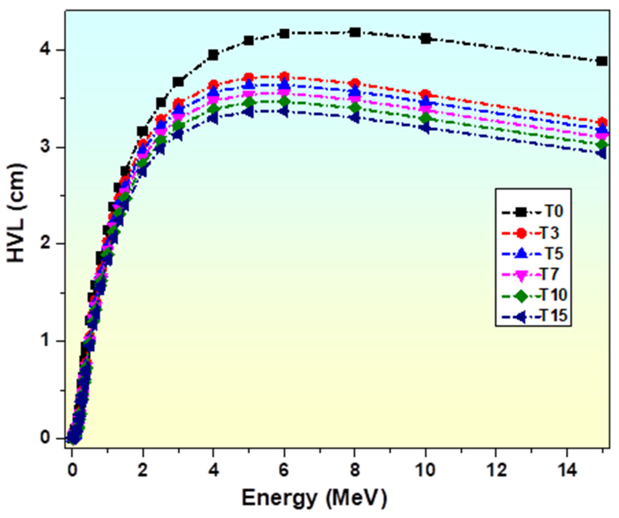 - Glass sample T15, which contains the highest TiO2 concentration, exhibits the lowest HVL and MFP values.