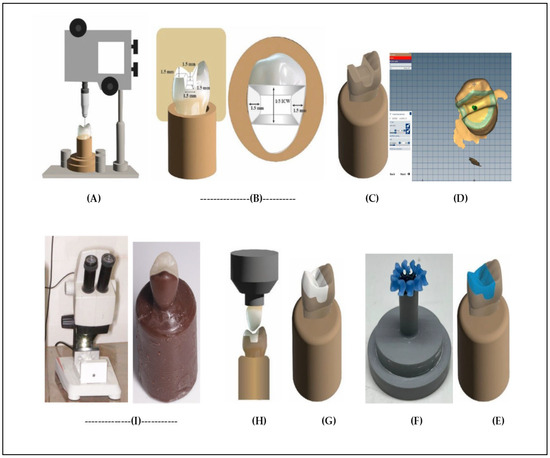 Flow chart illustrating the experimental steps of the study: (A) parallelometer used to secure the typodont tooth (master die) in the custom holder, and a milling surveyor used to perform onlay tooth preparation; (B) putty template guide used to control the preparation dimensions of onlay “lateral view and top view”; (C) the epoxy resin die (Replica) after duplication by silicon material; (D) CAD design of onlay after scanning of epoxy die; (E) milled wax pattern “CAD wax”; (F) spruing of CAD wax; (G) pressable ceramic onlay; (H) cementation of onlay using static load “5 kg”; (I) stereomicroscopic marginal gap evaluation of onlay after cementation on epoxy die.