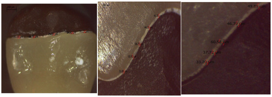 As previously mentioned [37], the vertical marginal distance between the epoxy die’s finish line and onlay margins was measured (Figure 2) using a handheld digital microscope with an integrated camera mounted on a stereomicroscopic stand (Dino-Lite Pro, Olympus, Tokyo, Japan) and connected to a personal computer with 40× magnification. Prior to starting measurements, the calibration instructions for the microscope were correctly followed. To overcome the difficulties of repeating the measurements of the marginal fit at the same distance and angle from the microscope capturing unit, a Sample Positioning Device (SPD) including a calibrated gauge, fixable base, and reading marks was created. Digital images were taken for each mesial, distal, bucco-occlusal, and lingual surface. Open-source software for processing and interpreting scientific photographs (ImageJ 1.53t, National Institute of Health, USA) was used to finish the digital analysis. Measurements and qualitative assessments of the gaps were performed by microns at the five predetermined points on the epoxy die for each surface, providing total of twenty readings for every restoration. The average marginal gap value for every restoration was determined by taking the mean of all readings.