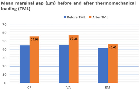 In terms of TML’s impact, the EM group’s vertical marginal gap mean value increased statistically significantly from 41.16 ± 5.09 µm (p = 0.002) prior to loading to 46.63 ± 1.76 µm following TML. Similarly, in the VA group, a significant increase was observed after TML (57.28 ± 3.27 µm after TML versus 46.42 ± 8.75 µm before loading) (p = 0.001). Moreover, restorations of the CP group exhibited a significant increase in marginal gap values of 45.7 μm before TML and 55.99 μm after TML with (p = 0.003). This means there was a significant difference within the groups after TML (Table 2 and Figure 3).