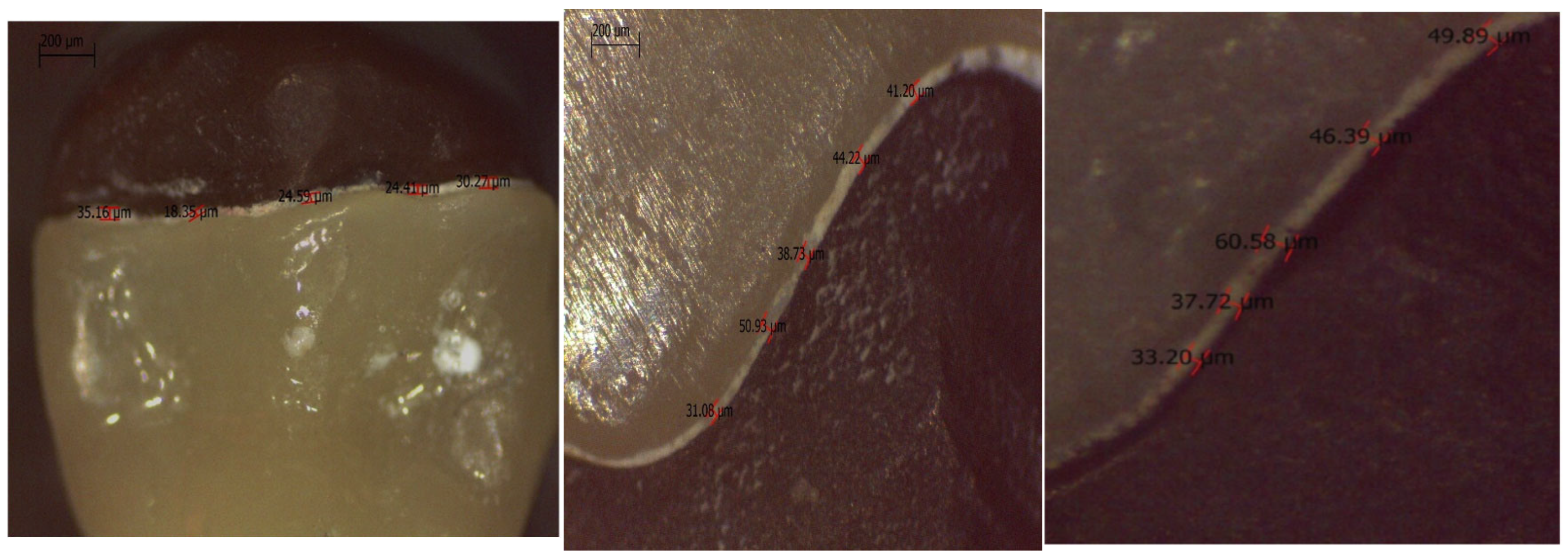 - Mclean, J.W.; von Fraunhofer, J.A. The estimation of cement film thickness by an in vivo technique. Br. Dent. J. 1971, 131, 107–111. [Google Scholar] [CrossRef]
