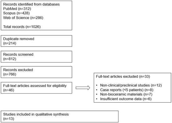 Exclusion criteria included case reports with fewer than five patients, purely preclinical studies, non-English articles, conference abstracts without full text, and studies lacking outcome data specific to bioceramic obliteration.
