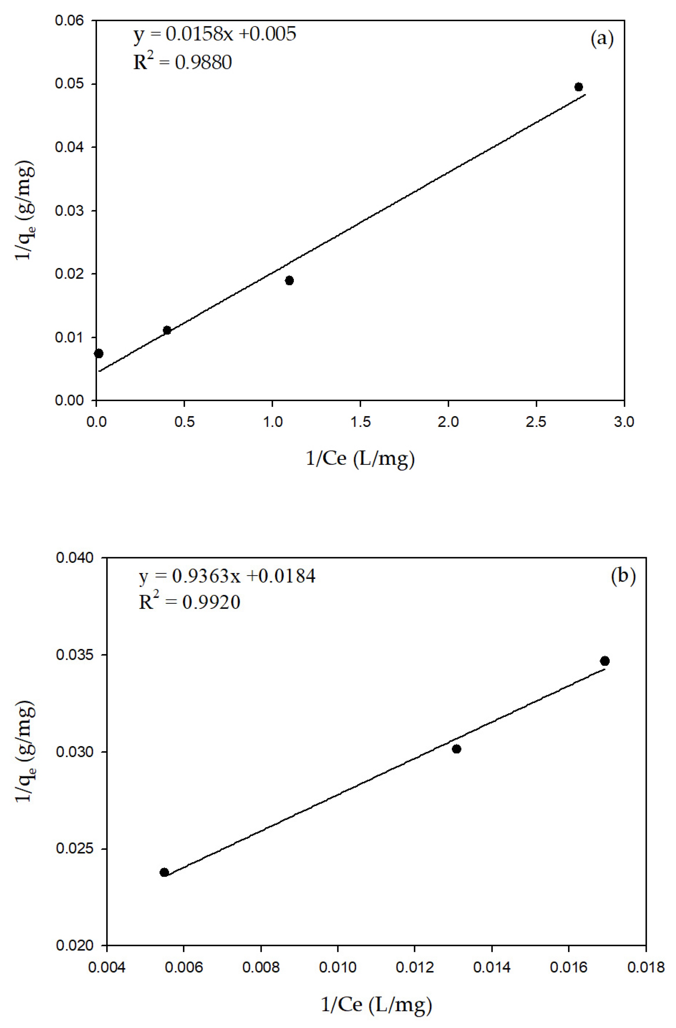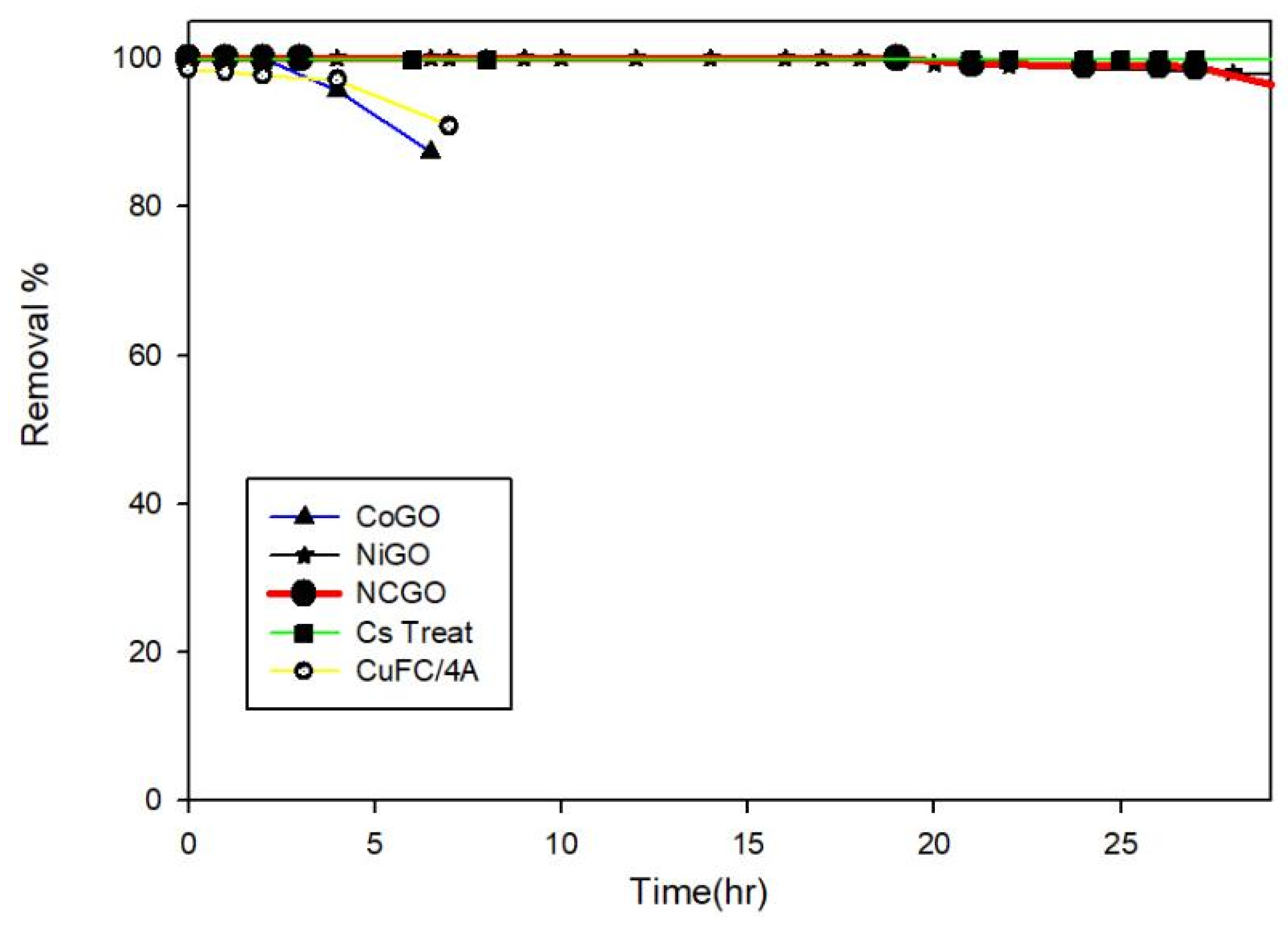 3.3. Cesium Removal Efficiency and Adsorption Capacity