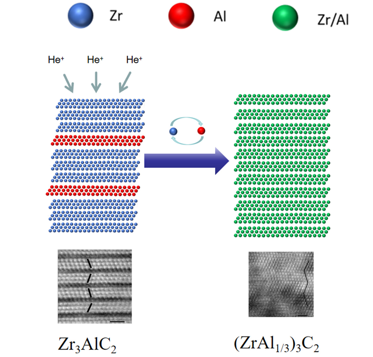 Irradiation induces pronounced structural changes in Zr3AlC2. Owing to the relatively weak bonding between Zr and Al atoms, the Al atomic layers are preferentially disrupted under irradiation, leading to the formation of a high density of Zr–Al antisite defects. The accumulation of these defects is believed to give rise to two concurrent effects.