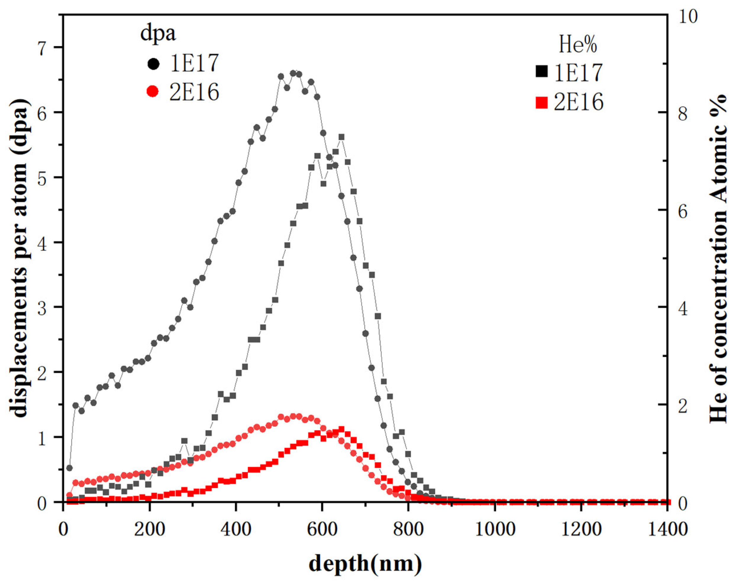 Figure 1. SRIM simulation results showing the damage profiles for 100 keV He+ ions at fluences of 1 × 1017 and 2 × 1016 ions/cm2.