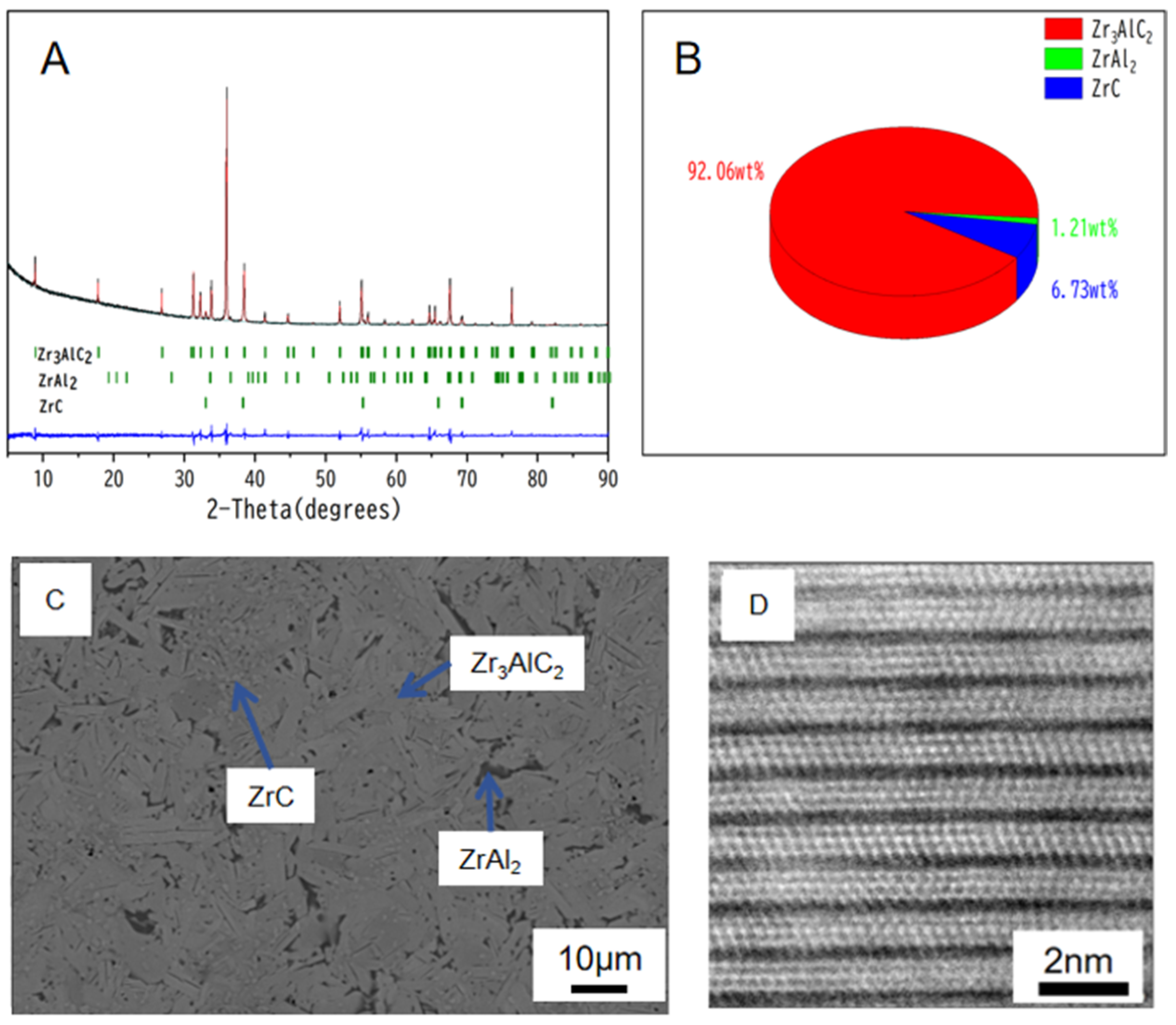 Figure 2C displays a scanning electron microscopy (SEM) image of the bulk sample. The microstructure is dominated by elongated, bar-like Zr3AlC2 grains, with ZrAl2 mainly located at the grain boundaries. Additionally, a small number of granular ZrC particles are observed. Figure 2D shows a scanning transmission electron microscopy (STEM) image taken along the [11–20] zone axis. The typical layered structure of the MAX phase is clearly visible. The brighter contrast corresponds to Zr atomic columns, while the darker contrast indicates the positions of Al atoms.