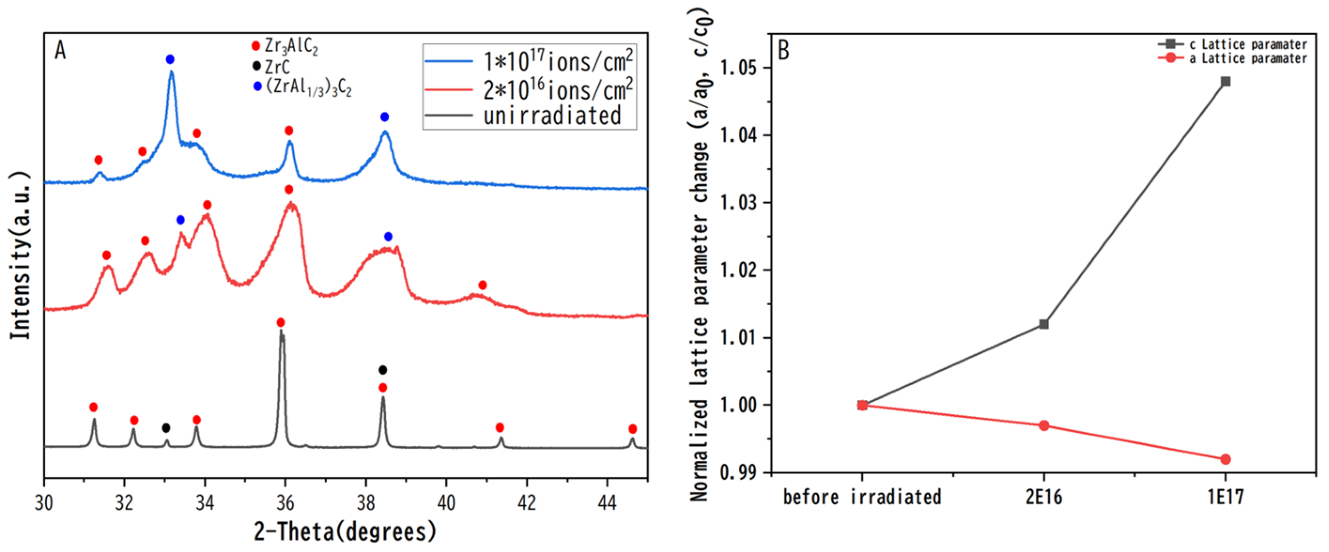 Figure 3. (A) GIXRD patterns of Zr3AlC2 samples before and after He+ ion irradiation measured at an incident angle of 0.5°. (B) Normalized lattice parameter changes (a/a0 and c/c0) of Zr3AlC2 as a function of irradiation fluence, where a0 and c0 are the lattice parameters of the unirradiated sample.