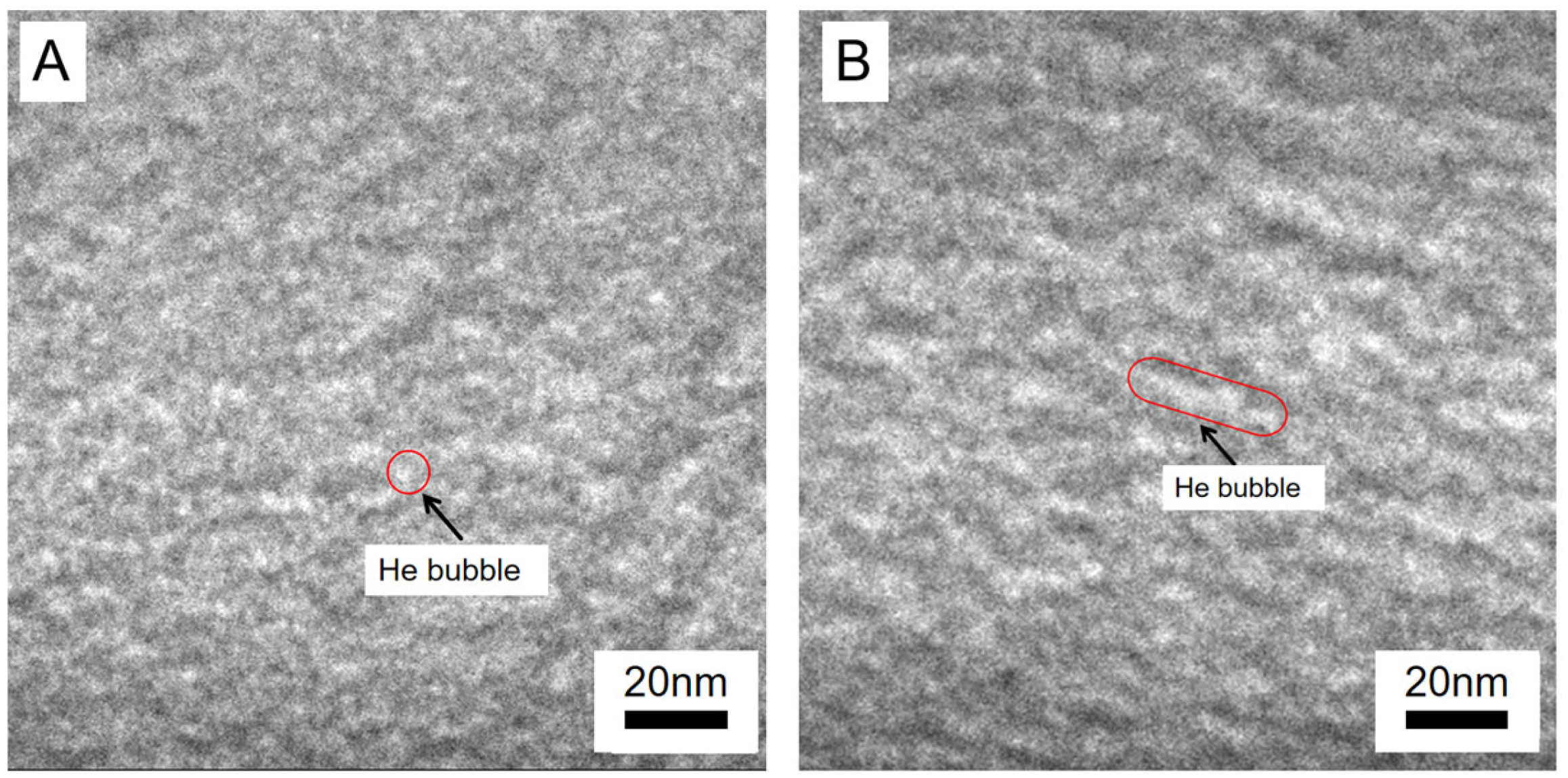 The average size of He bubbles at the two irradiation fluences was quantified using ImageJ software (1.54p) based on statistical analysis of multiple regions. With increasing irradiation fluence, the average He bubble diameter increases from 0.74 nm to 1.43 nm, indicating a clear fluence-dependent bubble growth behavior.