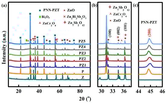 Figure 1 reveals the XRD spectra of all the ceramic samples. The peaks of the PZ1, PZ2, PZ3, PZ4 and PZ5 composite materials are almost entirely the peaks of the P piezoelectric and Z varistor phase. The PZm samples reveal characteristic peaks at 45° (as shown in Figure 1c) as well as at 31.8°, 34.5°, and 36.3° [3], as shown in Figure 1b, indicating that the PZm sample possesses both the perovskite phase and the wurtzite phase. In Figure 1c, the characteristic peaks near 45° [12] shift towards lower angles first and then towards higher angles as the molar ratio P/Z of the piezoelectric/varistor powder decreases. This indicates that the lattice constant of the composite ceramic first increases and then decreases. At the PZ3 sample, this characteristic peak has the smallest diffraction angle and the largest lattice constant, and currently, the P/Z = 1/1.2.
