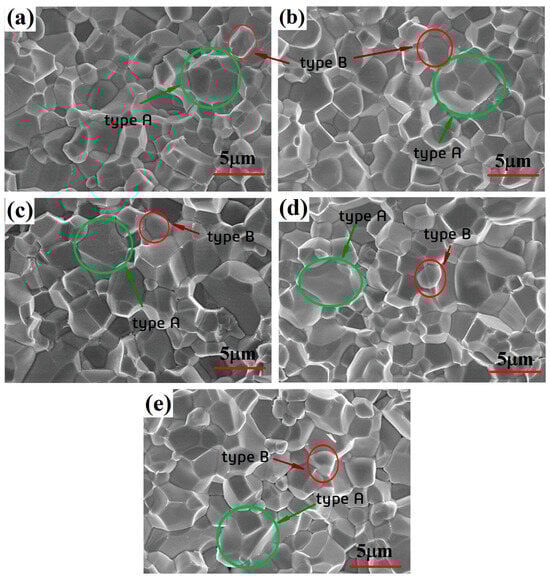 Figure 2 reveals the cross-sectional scanning electron microscope (SEM) images of the ceramics under a magnification of 5000×. Figure 2a–e are SEM images of samples with various molar ratios of the PZm (P/Z = 1/0.9, 1/1.05, 1/1.2, 1/1.35, 1/1.5). There are two types of grains in the ceramic samples, large A-type grains with sharp edges and large surface area B-type grains. Combining the XRD spectra, it can be determined that the A-type grains are perovskite phase and the B-type grains are wurtzite phase. As the P/Z ratio decreases, the sizes of the A-type and B-type grains first increase and then decrease. The distribution of A- and B-type grains is more uniform in the P/Z of the 1/1.2 ceramic sample with the largest grain size, indicating that the PZ3 sample has the best comprehensive performance, which is consistent with the previous electrical performance and XRD analysis results.