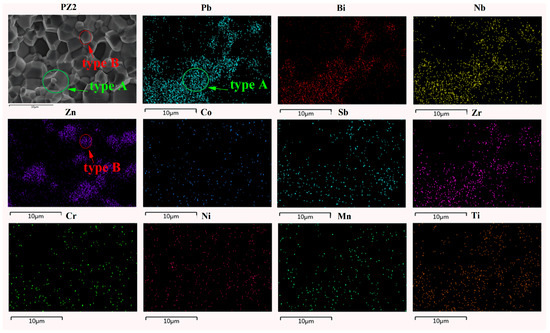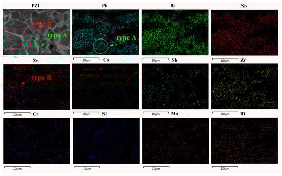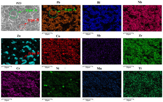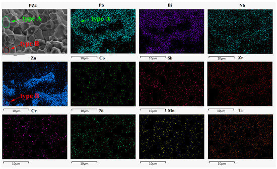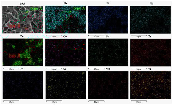 Figure 3, Figure 4, Figure 5, Figure 6 and Figure 7 display the mappings of all PZm samples with various ratios of P/Z. The distribution of Bi and Pb elements is similar, while the distribution of Zn and Pb elements is opposite. Combining the previous SEM and XRD images, it can be known that the Pb element is mainly distributed in the A-type grains, which are perovskite phases; the Zn element is mainly distributed in the B-type grains, which are wurtzite phases. Bi is distributed around the perovskite, and other elements are distributed in both the perovskite and wurtzite phases.
