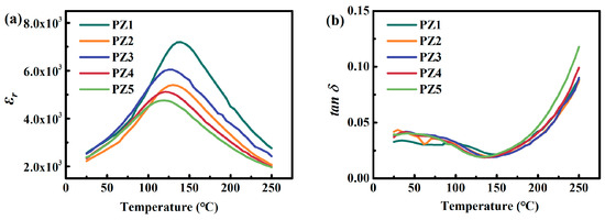 (a) Temperature dependence of the dielectric constant Ɛr for the PZm samples at 10 kHz. (b) Temperature dependence of the dielectric loss factor tan δ for the PZm samples at 10 kHz.