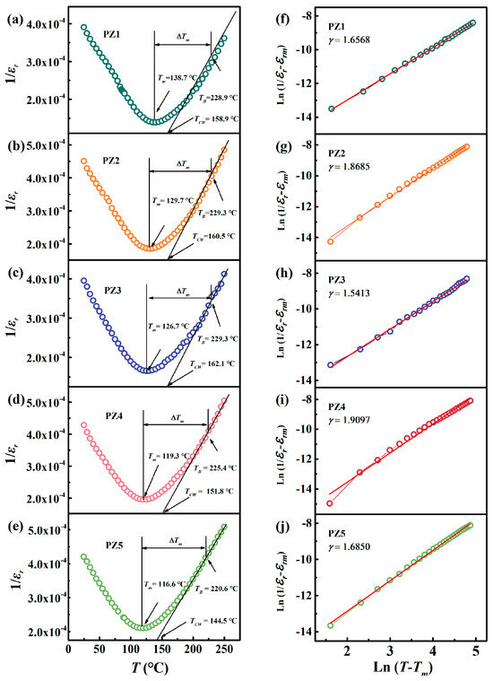 A comparison of the curves of Ɛr − T for the PZm samples prepared at 10 kHz. (a–e) 1/Ɛr − T, (f–j) ln (1/Ɛr − 1/Ɛrm) − ln (T − Tm).