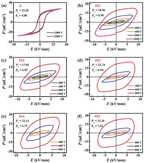 Hysteresis loops of the PZm and P samples: (a) P, (b) PZ1, (c) PZ2, (d) PZ3, (e) PZ4, (f) PZ5.