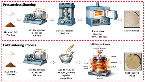Scheme illustrating the steps for the pressureless sintering and cold sintering process of HAp/BG ceramics.