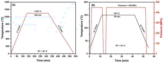 After the synthesis of the HAp and niobium–phosphate bioglass (BG) powders, two groups were prepared in terms of composition: the first consisted of pure HAp, and the second was composed of 96 wt.% HAp and 4 wt.% BG. Based on the rule of mixtures, the adopted density values were 3.16 g/cm3 for HAp and 2.956 g/cm3 for BG, resulting in a theoretical density of 3.1518 g/cm3 for the mixture. The HAp + BG powders were mixed in a ball mill for 120 min. Two different sintering routes were investigated for both materials: (i) conventional sintering and (ii) a novel cold sintering route, both illustrated in Figure 1. For pressureless sintering, the powders were first pressed into discs with a diameter of 13 mm using uniaxial pressing at 200 MPa. The green bodies were then sintered in a furnace at 1100 °C, with a heating rate of 8 °C/min, a holding time of 180 min at 1100 °C, followed by cooling at 5 °C/min down to room temperature. This route was adapted from the work of Feng et al. [20]. Figure 2a illustrates the heating schedule adopted for the pressureless sintering process.