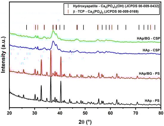 For the PS samples (1100 °C), the diffractograms present sharp and high-intensity reflections, characteristic of highly crystalline materials. Peak indexing confirms the presence of hydroxyapatite (HAp, Ca5(PO4)3(OH); JCPDS 00-009-0432) [25] as the main phase, together with additional reflections assigned to β-tricalcium phosphate (β-TCP, Ca3(PO4)2; JCPDS 00-009-0169) [26]. The emergence of β-TCP indicates partial HAp decomposition at high temperature, consistent with the known loss of HAp phase stability above ~900 °C. The narrower and more intense peak profiles also imply reduced peak broadening, which is directly associated with crystallite coarsening; this trend agrees with the larger crystallite sizes obtained for PS samples (26.74 ± 11.37 nm for HAp and 30.10 ± 5.48 nm for HAp/BG) and the concomitant reduction in surface energy (85.20 ± 39.53 m2/g and 64.42 ± 8.74 m2/g, respectively), as diffusion-driven sintering promotes grain growth and lowers specific surface area.