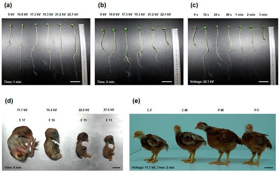 Effects of non-thermal dielectric barrier discharge (DBD) plasma treatment on soybean sprout growth and chicken development. (a) Representative 6-day-old soybean sprout appearance treated with plasma at different voltages for 1 min. Scale bar: 5.0 cm. (b) Representative 6-day-old soybean sprout appearance treated with plasma at different voltages for 2 min. Scale bar: 5.0 cm. (c) Representative 6-day-old soybean sprout appearance treated with plasma at 22.1 kV for different durations. Scale bar: 5.0 cm. Twenty soybean seeds in each group were treated, and each experiment was performed three times. The statistical validity was shown in the study of Zhang et al. [17]. (d) Representative chicken embryos from stage HH 20 were treated with plasma at different voltages for 4 min. Scale bar: 1.0 cm. The death day was estimated according to the Hamburger-Hamilton stages. E represents the embryonic day. Eight fertilized eggs in each group were treated, and this experiment was performed three times. The statistical validity was shown in the study of Zhang et al. [18]. (e) Representative growth status of female and male chickens on day 30 after plasma treatment on fertilized eggs at a voltage of 11.7 kV for 2 min. Scale bar: 5.0 cm. C-F represents female chicken in the control group; C-M represents male chicken in the control group; P-M represents male chicken in the plasma treatment group. P-F represents female chicken in the plasma treatment group. Twenty plasma-treated females and 20 plasma-treated males in each group were analyzed, and this experiment was performed three times. The statistical validity was shown in the study of Zhang et al. [19].