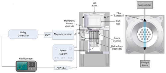 Figure 1 shows a schematic of the plasma source used throughout this study. The reactor can be separated into two parts. The lower part of the reactor is the plasma module, which consists of 19 electrode assemblies housed in a plenum chamber. Each electrode assembly is made up of an 80 mm stainless steel rod with a 3.5 mm hemispherical cap at the tip. These are then placed within a quartz crucible with a wall thickness of 1.5 mm, which acts as the dielectric barrier. A polytetrafluoroethylene (PTFE) plug holds each rod within the crucible. Each rod is connected to a stainless-steel ring, which is also connected to the output of the power supply. At a gap of 2 mm above the tip of each crucible is a grounded nickel membrane. The nickel membrane (Micropore Ltd) has a pore size of 20 µm and a pitch of 180 µm. Compressed air is supplied to the bottom of the plasma module at 1 standard litre per minute (SLPM) from a mass flow controller (PR 4000B, MKS, Andover, MA, USA) and flows upwards through the plasma module housing. The plasma forms between the crucibles and the membrane, and the plasma effluent passes through the pores of the nickel membrane into the upper part of the reactor, the reaction tank. The tank has a height of 100 mm and a diameter of 140 mm, with a typical liquid treatment volume of ~1 litre. At the centre of the reaction tank is a draft tube with a height of 50 mm and diameter of 80 mm, allowing for good mixing within the reactor when treating a liquid [28]. For the work reported in this paper, the reactor was operated without liquid; however, the reactor can be used for pre-treatment of biomass [29,30] and wastewater [31]. The gas exits the reactor through a port in the centre of the top lid. Further details of the reactor used can be found elsewhere [32].