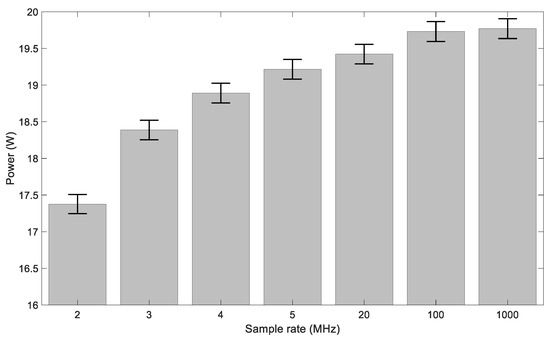 A current probe (2877 Pearson, Pearson Electronics, Palo Alto, CA, USA), a high voltage (HV) probe (P6015, Tektronix, Beaverton, OR, USA) and an oscilloscope (DP4104B Tektronix, Beaverton, OR, USA) were used to measure the current and voltage waveforms. Waveforms were sampled at least at 100 MHz as lower sampling rates affect the temporal resolution of the current waveform, causing an underestimation of the power delivered to the plasma (see Figure 2). The voltage and current waveforms were recorded and post-processed to calculate the power, taking into account the different delays introduced by the probes. The power was calculated multiplying the instantaneous voltage and current traces and then averaging over a period. For plasmas sustained with a continuous wave, the power calculation was in agreement (±2%) with the power measured using a sensing capacitor and the Lissajous method [33]. Given the pulsed nature of the waveforms under study and the transients observed in the experimental data (see discussion below), the Lissajous method was found to be unsuitable for the present study.