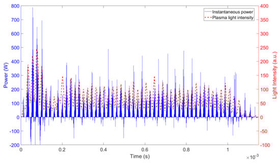Figure 3 shows the comparison of the measured instantaneous power and the emission intensity, with both measurements revealing a transient response at the beginning of the on-time pulse. Regardless of the on-time duration, at the beginning of the on-time pulse the power and light intensity recorded in the experiments show a transient with an “overshoot” that oscillates and attenuates exponentially as time progresses. The cause of this damped oscillating overshoot is a combination of the topology of the resonant power supply and the plasma impedance, which combined create an RLC equivalent load for the H-bridge. After approximately 300 μs, the oscillation was damped and the average power delivered during the rest of the on-time was fairly constant.