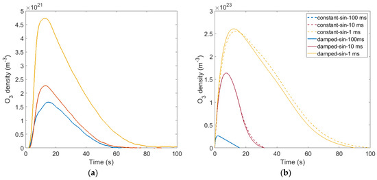 Since the simulation results capture the same trend, even when no oscillation is incorporated in the input power waveform (Figure 5b), it follows that the increased power delivered with the shorter on-times is not the main factor contributing to the enhanced ozone production. The underpinning mechanism is discussed in the Plasma Chemistry section below.