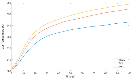 Figure 6 shows the temporal evolution of the discharge gas temperature for the three on-times. Shorter on-times result in higher gas temperature, with 1 ms reaching 359 K after 100 s, 10 ms 355 K and 100 ms 343 K. The temperature rise is faster over the first 20 s for all cases.