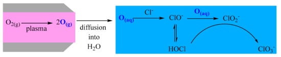 - Jirásek, V.; Lukeš, P. Formation of reactive chlorine species in saline solution treated by non-equilibrium atmospheric pressure He/O2 plasma jet. Plasma Sources Sci. Technol. 2019, 28, 035015. [Google Scholar] [CrossRef]