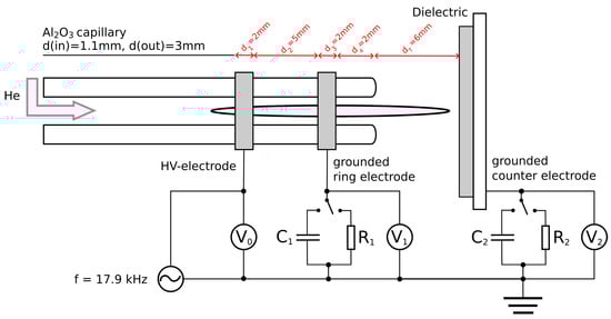 Figure 1 shows a schematic of the experimental setup. The plasma source consisted of an alumina capillary with a 3 mm outer and a 1.1 mm inner diameter. A gas flow of 2 slm helium was introduced through the capillary. A sinusoidal voltage was applied on the first copper electrode (high voltage (HV) electrode in Figure 1). To create a high voltage, a sinusoidal signal generated by a waveform generator (f = 17.9 kHz, PicoScope 3460B, Pico Technology, St Neots, UK) was amplified by a power amplifier (AG 1021, T&C Power, Rochester, NY, USA) in series with a high-voltage transformer. The second copper electrode was grounded. The dielectric surface had a distance to the opposing capillary orifice and was grounded via an attached copper plate. A high voltage probe (P6015A, Tektronix, Inc. Beaverton, OR, USA) was connected to the first ring electrode for high voltage measurements. To measure the input power, a current monitor (6585 Pearson Electronics, Palo Alto, CA, USA) was placed around the input HV line. Optionally, the current over resistors or the voltage drop over Styroflex capacitors pF was measured with voltage probes (TA131, Pico Technology, St Neots, UK), where i represents the grounded ring electrode (1) and the grounded counter electrode (2).