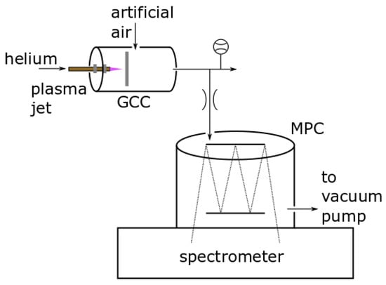 Plasma devices operating at atmospheric pressure are a useful tool for many applications, from exhaust treatment to medical use [,,]. The unique properties of the devices arise from the local generation of multiple reactive species on the spot []. A broad range of investigations consider the application of plasma treatment of surfaces aiming to coat, decontaminate or heal specific surfaces. However, the diagnostics of the devices were performed while operating without a target in front [,,].