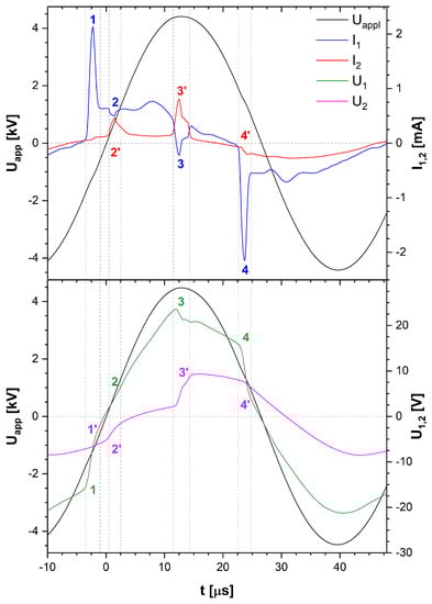 Current and voltage characteristics of the discharge in helium with SiO as dielectric target ( , = 6 mm). 1–4 and 1’–4’ mark characteristic events.