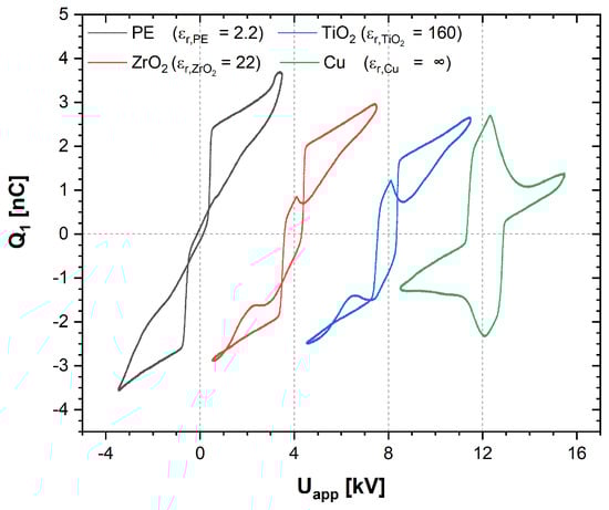 Q–V-plot for representative dielectric targets and copper target with an applied voltage offset between each dielectric ( = 6 mm).