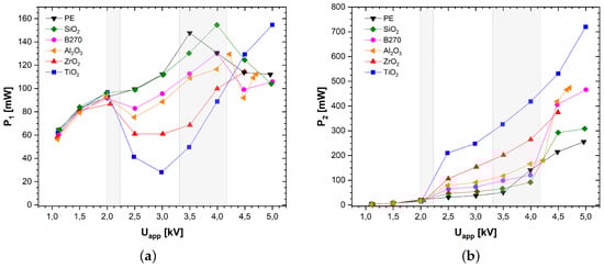 In Figure 5, the measured dissipated power at the ring electrode and the counter electrode is shown for different applied voltages. Each curve represents one dielectric target at the counter electrode. With increasing voltage, the dissipated power at the ring electrode starts to rise until it reaches 2 kV (first grey bar). Above 2 kV, a drop in dissipated power is observed for each dielectric material followed by a rise up to 4 kV (second grey bar). Around a voltage of 4 kV, most dielectrics show a second drop in dissipated power at the ring electrode that correlates with a second inverse current pulse. Only for , which has the the highest , this second drop was not observed within the operated voltage range.