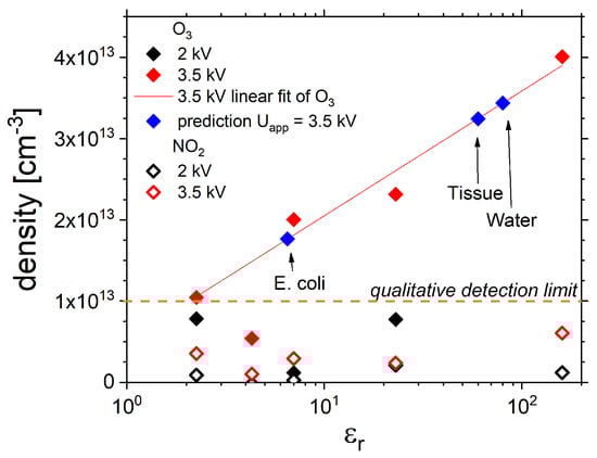 Now, correlating the dissipated power with the species production by measuring the far-field densities shows a clear tendency towards an increased density by up to one order of magnitude for an applied voltage of 3.5 kV compared to 2 kV (Figure 6). For , species densities of O3 and NO2 do not exceed the quantitative detection limit of about , yet qualitative detection was possible in all cases (low densities). For , the O3 density increases with the increasing permittivity from up to while NO2 does not reach a quantitative detection limit of but was observed qualitatively again. Other species absorbing in the considered wavenumber range of 700 to 4000 cm−1 could not be detected.