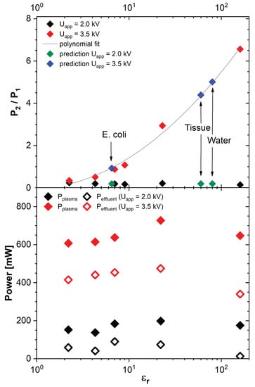 (Top) ratio of dissipated power at the target electrode (2) and the ring electrode (1) for voltage amplitudes of 2 kV and 3.5 kV. In addition, the expected values for a target electrode consisting of , tissue or water are extrapolated. (Bottom) the plasma power and the effluent power from Equations (4) and (5) are presented for voltage amplitudes of 2 kV and 3.5 kV, = 6 mm.