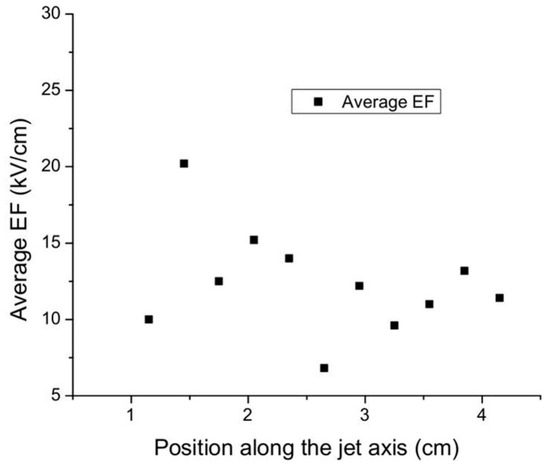 Mean magnitude of the electric field along the axis for a plasma plume emitted by a pulsed plasma jet [1].