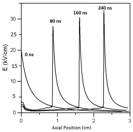 Low temperature plasma jets exhibit large electric fields at the tip of their plasma plumes. The magnitude of this field was measured by several investigators and was found to be in the 10–30 kV/cm range [1,2,3,4]. Figure 1 shows measurements of the electric field reported by Begum et al. [1] while Figure 2 shows simulation results reported by Naidis [5]. When impinging on a dielectric material, the plasma plume causes charge build up on the surface of the dielectric surface. Therefore, via capacitive coupling, the electric field can be effectively transmitted to the area behind the dielectric barrier [6,7,8]. Under reduced pressure, the transmitted field can be large enough to start a discharge, which quickly propagates and grows in volume [9].