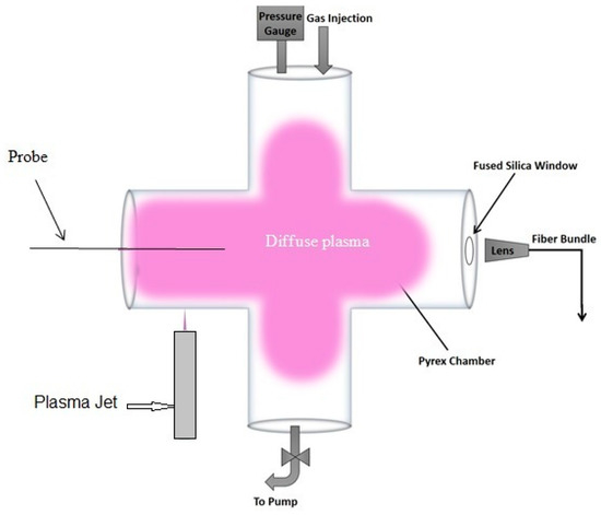 The tubing/chamber is made of Pyrex glass, where the pressure can be reduced gradually down to the mTorr range. The plasma jet is physically independent of the chamber and is applied externally. It is driven by repetitive narrow pulses (ns–µs) with magnitudes in the kV range. The tip of the plasma plume is brought against the external wall of the chamber to ignite a plasma at reduced pressure.