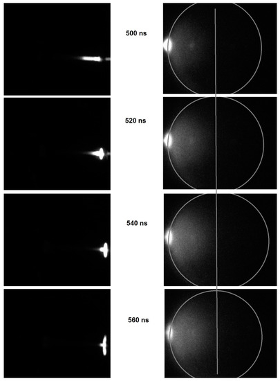 ICCD images of the expansion of the diffuse plasma inside the chamber, taken 20 nanoseconds apart, are shown in Figure 8 (using a Dicam Pro ICCD). The images show that, as the ionization wave front (i.e., plasma bullet) impinged on the outer surface of the chamber, a discharge was ignited behind the Pyrex glass wall. A glowing and expanding plasma advanced radially in all directions inside the chamber. The speed of expansion was estimated to be in the 106–107 cm/s range, consistent with that of an ionization wave in gases at low pressure.