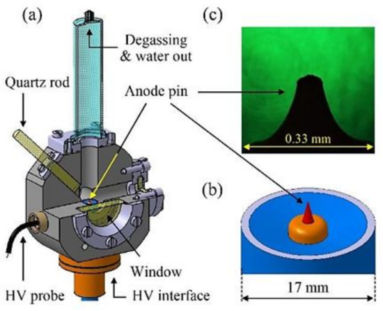 Simplified sketch of (a) the reactor chamber composed of a grounded stainless-steel body, fused silica windows for optical diagnostics, and a water inlet/outlet, (b) coax-based high-voltage (HV) electrode. Image (c) shows the tip of the anode pin used in this study.