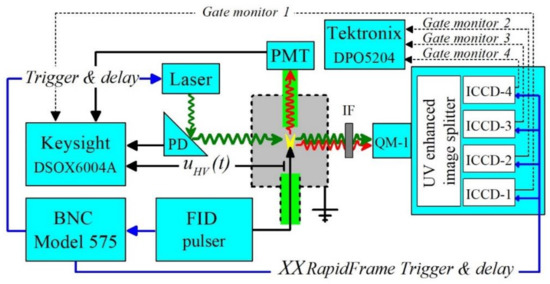 The block scheme of the complete diagnostic setup is shown in Figure 2. The imaging system was made of a Questar QM-1 long-distance microscope and Stanford Computer Optics high-speed four-channel framing camera XXRapidFrame. The XXRapidFrame consists of a single optical input, UV-enhanced mirror-based image splitter, and four ICCD (4-Picos) cameras. The image splitter guarantees a flat spectral response over the UV, visible, and near infrared (NIR) ranges and splits the arriving flux of photons equally among the four exit channels (Ch1–Ch4). Each ICCD detector is equipped with an 18 mm dual-stage microchannel plate (MCP) image intensifier (S20 photocathode) allowing the acquisition of time-resolved images taken with a pre-selected MCP gating time (a minimum nominal gating time of 200 ps). This enables the registration of four successive time-resolved images taken with a required frame rate.