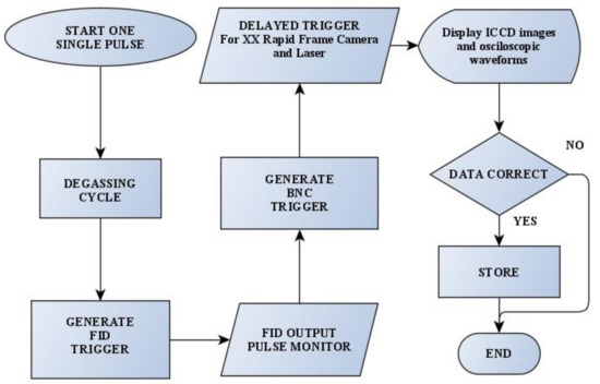 This experiment is based on the acquisition of hundreds of sequences of four ICCD images together with the corresponding oscilloscopic and PMT waveforms synchronously with the DI water degassing cycle performed before triggering any discharge event. We focused on capturing the morphology of the luminous filaments developing during the primary HV pulse and on the replication of the luminous filamentary structures occurring during the subsequent reflected HV pulses. The experiment was fully computer-controlled to acquire data from a statistically significant number of single discharge events at reproducible conditions for the analysis. Figure 3 complements Figure 2 and shows the flowchart of the automated experimental sequence consisting of the DI water conditioning, discharge event trigger, and laser pulse trigger, followed by data acquisition and storage. A personal computer (PC) running a LabVIEW 2016 virtual instrument (VI) program controls the entire sequence associated with one discharge cycle. This sequence starts by conditioning the DI water inside the discharge chamber, sending appropriately delayed trigger signals, displaying the acquired images and waveforms, and storing the validated data for further post-processing.