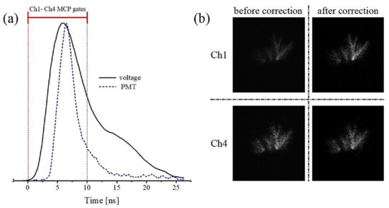After applying the averaged calibration intensity coefficients, the equivalent ICCD images from any of the channels can be obtained, as illustrated in Figure 4. Figure 4a shows the conditions used to acquire a set of calibration images—that is, the position of identical Ch1–Ch4 MCP gates with respect to both the HV waveform and the discharge luminosity evolution (monitored through the PMT signal). The MCP gates (gate width of 10 ns) ensured the collection of discharge emission from the fully expanded and developed luminous filaments. Figure 4b illustrates the calibration images before and after applying the correction. The Ch4 image used as a reference shows no modification (background subtraction is not visible on a linear scale), whereas the Ch1 image shows a notable increase in the luminosity of the captured filaments.