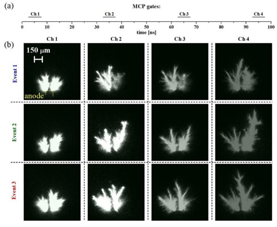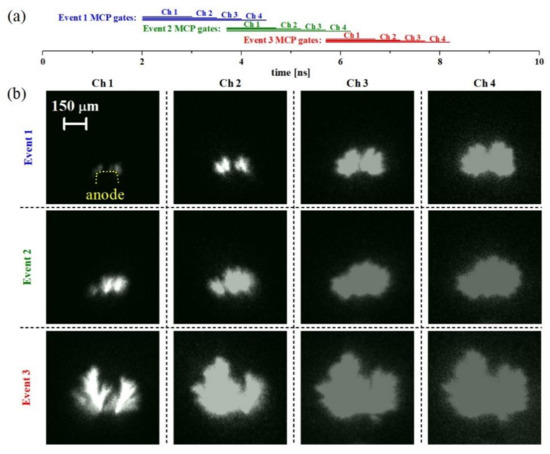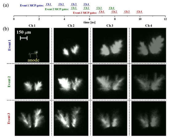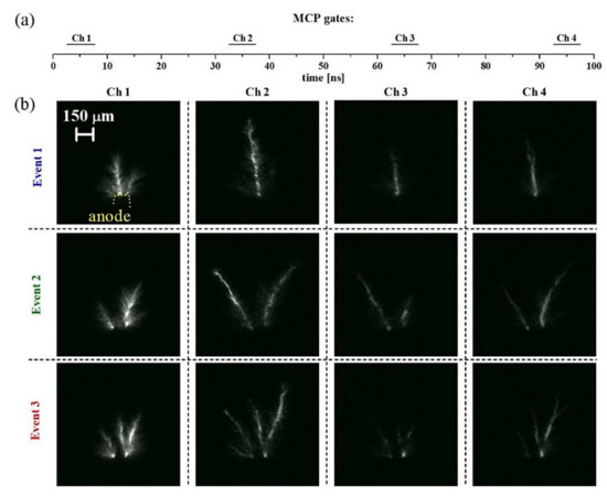 Case study B; image sequences obtained with broadband discharge emission. Horizontal bars in (a) labelled as Ch1–Ch4 illustrate the timing of the Ch1–Ch4 MCP gates with respect to the onset (time t = 0 ns) of the HV pulse. Images in panel (b) show the evolution of selected events during the primary HV pulse acquired by using the Ch1, Ch2, Ch3, and Ch4 MCP gates of 1, 1.5, 2, and 2.5 ns, respectively.