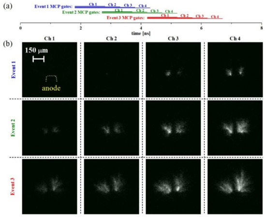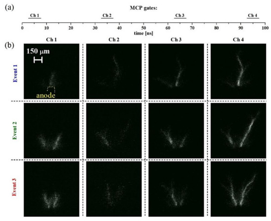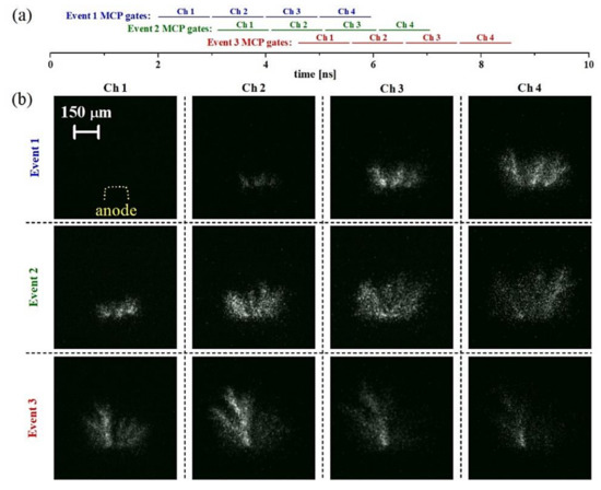 Case study B; image sequences obtained with the discharge emission that passes through the λc = 532 nm interferential filter. Horizontal bars in (a) labelled as Ch1–Ch4 illustrate the timing of the Ch1–Ch4 MCP gates with respect to the onset (time t = 0 ns) of the HV pulse. Images in panel (b) show the evolution of selected events during the primary HV pulse acquired by using the Ch1, Ch2, Ch3, and Ch4 MCP gates of 1, 1.5, 2, and 2.5 ns, respectively.