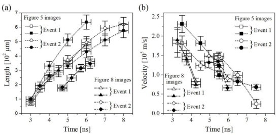 Length (a) and expansion velocity (b) of the fronts of the primary luminous filaments. Length obtained as a geometrical distance of the luminous front from the root of the filament at the anode tip. Expansion velocity obtained from geometrical distance of two captured luminous fronts and the time interval between the closing edges of the corresponding MCP gates. Evaluated from the Event 1 and 2 image sequences shown in Figure 5; Figure 8.