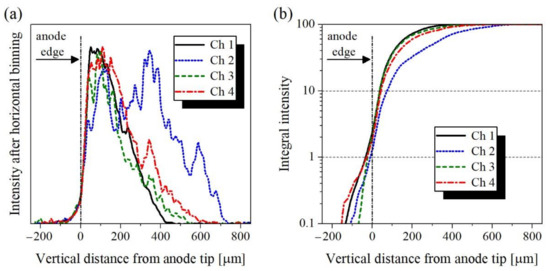 The image sequences obtained in this study provide an ideal tool to evaluate the luminosity collected from the anode and bulk filament regions. To perform this test, we used the Event 1 image sequence from Figure 12 (luminosity captured through the λc = 532 nm IF). The Ch1–Ch4 images were processed via full horizontal binning (i.e., the 2D ICCD matrix was reduced to a single column by integrating the ICCD pixels along each row). Subsequently, the resulting columns were integrated from bottom to top and then normalised to 100. Whereas the first procedure (full horizontal binning) integrates emission from the line-of-sight projections collected by individual ICCD rows (i.e., from various planes perpendicular to the anode axis and at various distances from the anode tip plane), the second integral reveals the percentage of the total monochromatic radiation collected in the given image as a function of the distance from the anode tip. The results obtained from the Ch1–Ch4 images are shown in Figure 15. The curves resulting from horizontal binning (Figure 15a) reflect the maximum extension of the luminous filaments. The full black line tracks the filaments produced during the primary HV pulse (Ch1) and expanding up to 400 μm away from the anode tip. The other curves track the follow-up filaments produced during the first three reflections (Ch2–Ch4) with the longest extension (up to 700 μm) occurring during the first HV reflection. Considering a nominal spatial resolution of the ICCD images (3.6 μm/pixel), we define the volume delimited by two horizontal planes below (−10 μm) and above (+10 μm) the anode tip as the well-resolved anode region. Then, the fraction of luminosity collected from the anode region does not exceed 3–4% of the aggregate, and more than 90% of the aggregate originates from regions with the anode tip distances larger than 50 μm. Moreover, all the curves in Figure 15 show a very smooth growth in the anode region (±10 μm), which practically excludes the possible existence of significant hot spots on the anode surface that might produce intense thermal black-body radiation (such as that reported in [14]).